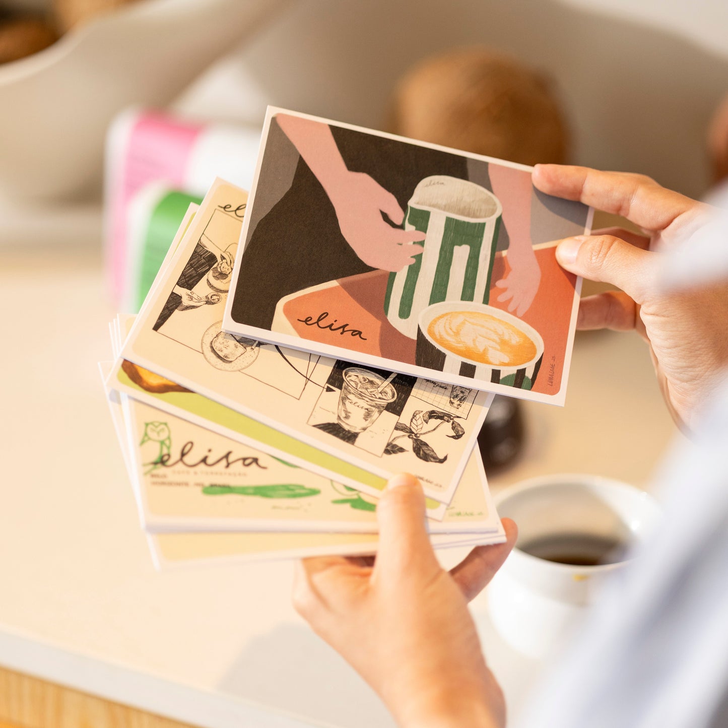 Kit exclusivo com 8 cartões e envelopes ilustrados pela artista Luma Lage, inspirados no universo do café. Cada peça traz traços delicados e referências sutis ao ritual de preparar e apreciar um bom café.
