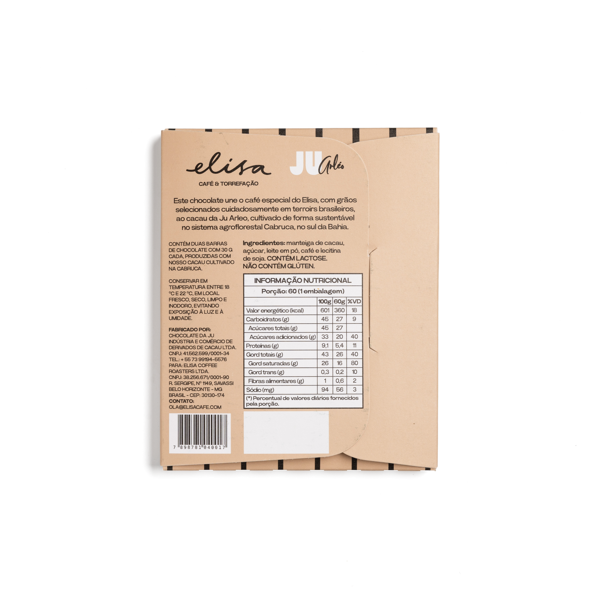 Diretamente da seleção cuidadosa de grãos da Ju Arles, este chocolate une a intensidade do cacau ao aconchego do leite cremoso e ao toque especial do café Elisa.