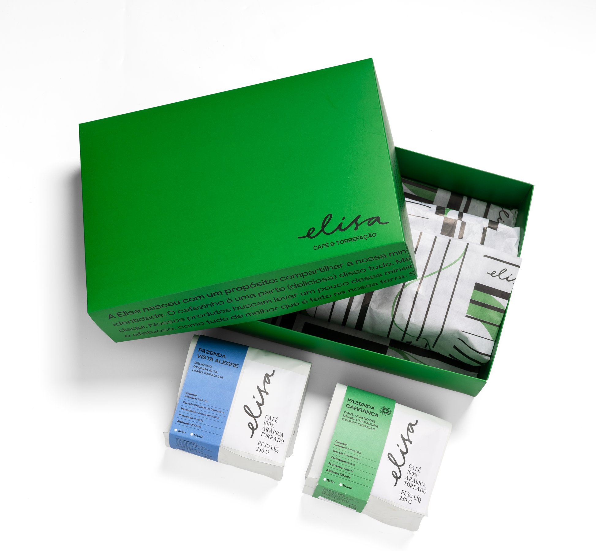 Conteúdo • Caixa personalizada Elisa • 3 cafés especiais 200g cada (grãos ou moído) e 1 café especial de 150g (grão ou moído) • 4 cards explicativos: origem, notas sensoriais e história de cada café